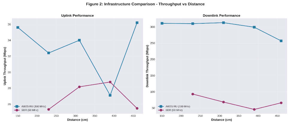 Comparing SDR performance at 50 MHz to the USRP performance at the same bandwidth reveals the importance of infrastructure design. The USRP system achieved only 0.288-0.307 Mbps uplink at 50 MHz, while the SDR system delivered 21.0-29.8 Mbps uplink at the same bandwidth. This hundred-fold difference cannot be attributed to bandwidth alone, indicating that hardware architecture, antenna design, and signal processing implementation play dominant roles in determining achievable throughput.
