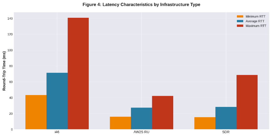 AW2S RU latency performance demonstrated significant improvement over smaller bandwidth configurations. Minimum RTT values ranged from 13.8 to 18.8 milliseconds, while average latencies remained between 23.5 and 29.4 milliseconds across all test locations. Maximum latency values were tightly bounded between 36.3 and 55.2 milliseconds, indicating minimal variance and consistent performance. This stability is essential for latency-sensitive applications such as real-time communications and interactive services. Figure 4 provides a comparative visualization of latency characteristics.