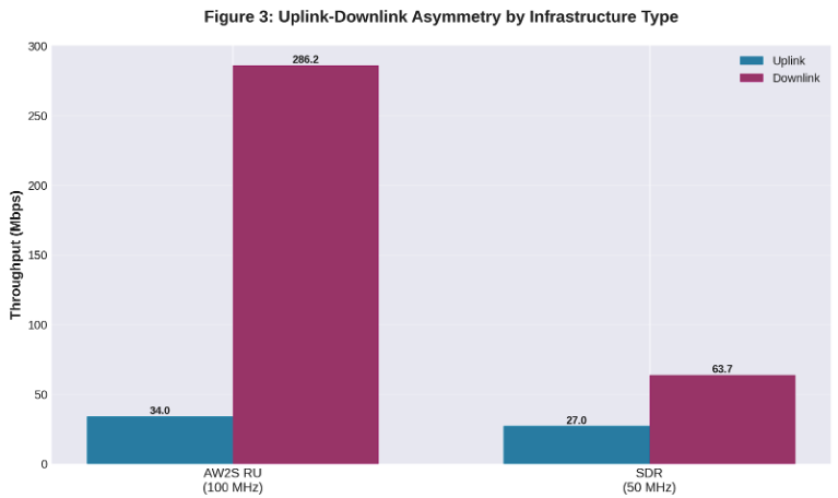 The pronounced asymmetry between uplink and downlink throughput in both AW2S RU and SDR configurations reflects fundamental differences in link budgets and resource allocation strategies. Base stations typically employ higher transmit power, more sophisticated antenna arrays with beamforming capabilities, and more complex receivers compared to user equipment. These advantages manifest as substantially higher downlink data rates, with the AW2S RU achieving approximately tenfold higher downlink than uplink throughput. Figure 3 illustrates this asymmetry across infrastructure types.